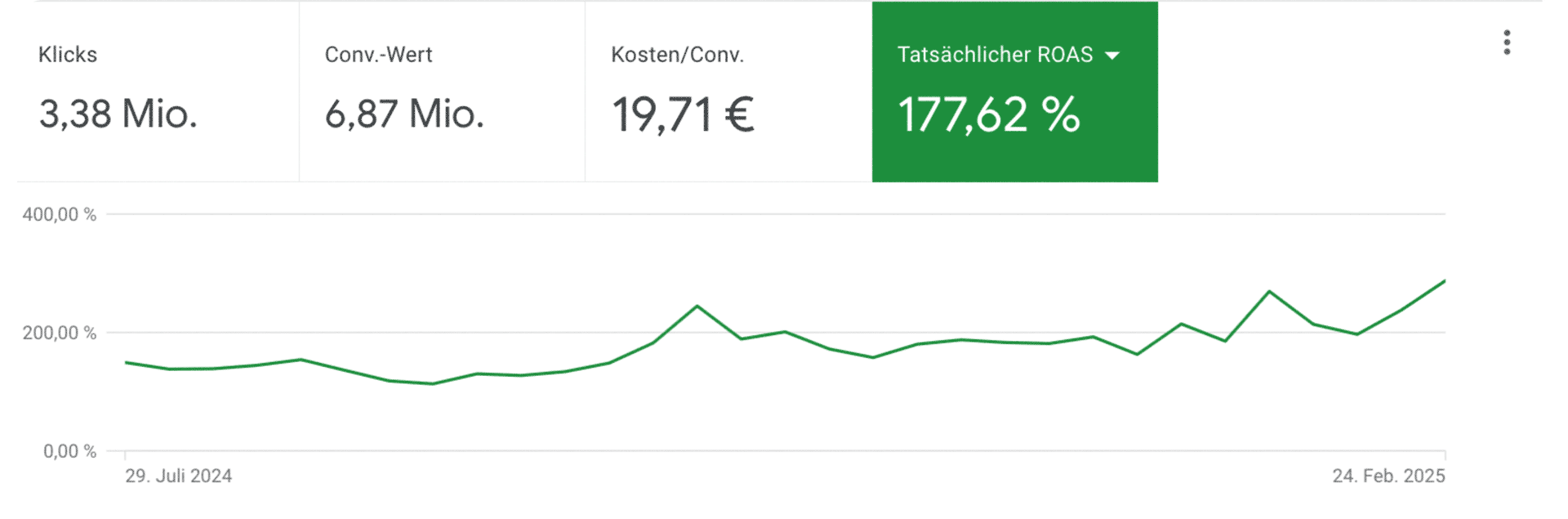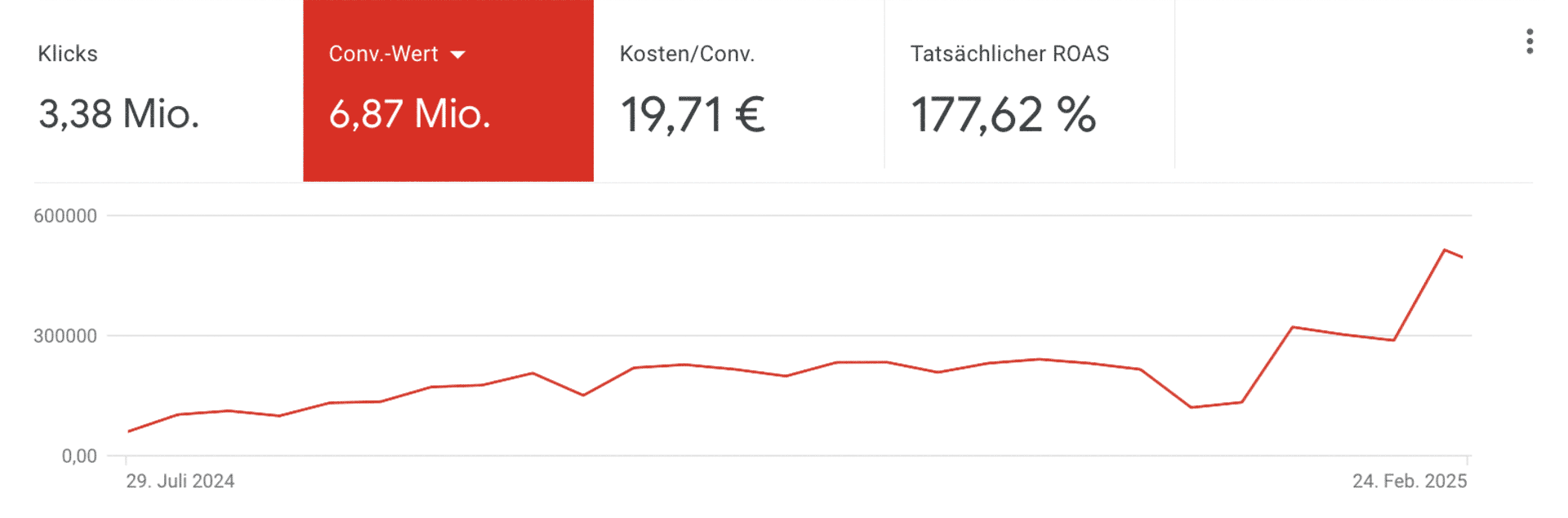 Im Zeitraum von August 2024 bis Ende Februar 2025 haben wir über die von uns betreuten Google Ads-Kampagnen den Conversion-Wert um das 2,4-fache gesteigert und damit Conversions im Millionenbereich generiert.